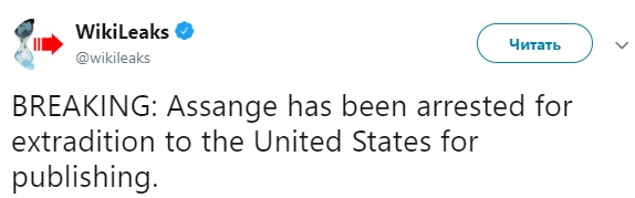 В твиттере Wikileaks сообщается, что Ассанжа экстрадируют в США, хотя ранее президент Эквадора Ленин Морено заявлял, что его не экстрадируют в страну, где ему могут грозить пытки или смертная казнь — в частности, США. Президент Эквадора уверял, что получил соответствующие гарантии от Великобритании.