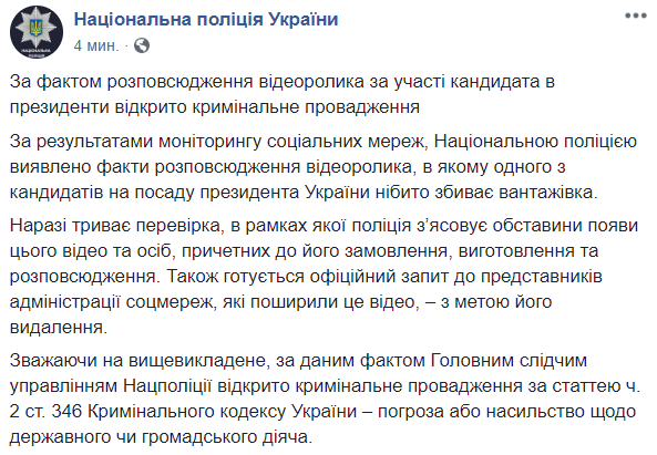 "По результатам мониторинга социальных сетей, Национальной полицией выявлены факты распространения видеоролика, в котором одного из кандидатов на пост президента Украины якобы сбивает грузовик.
