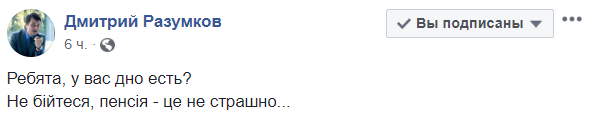 "Ребята, у вас дно есть? Не бойтесь, пенсия - это не страшно", - комментирует советник Зеленского Дмитрий Разумков.