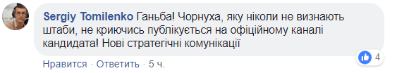 "Позор! Чернуха, которую никогда не признают штабы, не таясь публикуется на официальном канале кандидата! Новые стратегические коммуникации", - пишет у него в комментариях глава НСЖУ Сергей Томиленко.