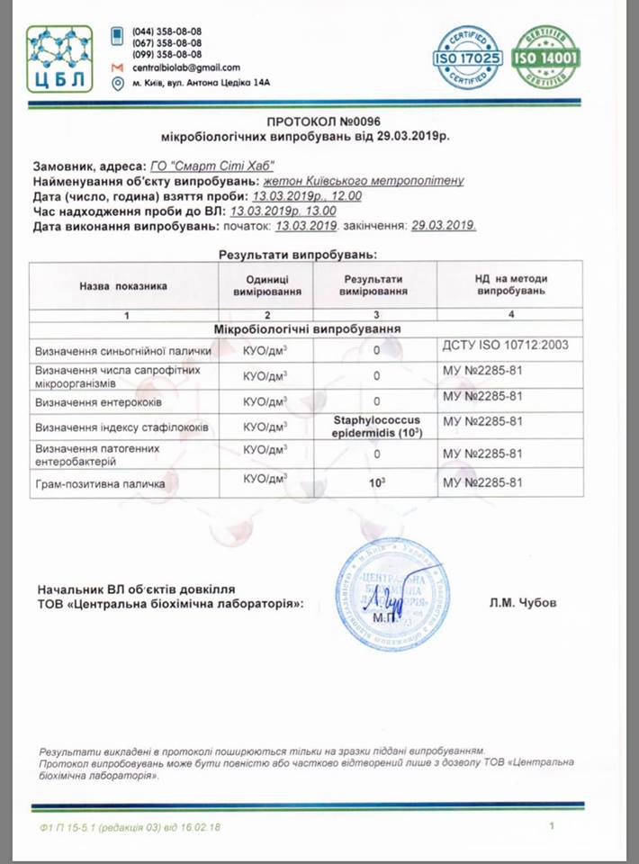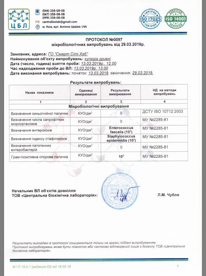 В сообщении говорится, что результаты исследования в биохимической лаборатории обыкновенной купюры номиналом 1 гривна и жетона метро, выявили на этих предметах возбудителей стафилококка и патогенных энтеробактерий.