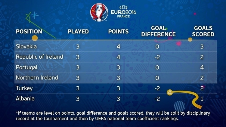 Из четырех оставшихся команда были выбраны две, имеющие лучшую разницу забитых и пропущенных мячей. У сборных Португалии и Северной Ирландии она равна нулю: португальцы забили 4 и пропустили столько же, а северные ирландцы два забили и два пропустили. В то время, как у Албании и Турции разница отрицательная: -2.