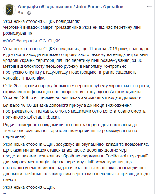 "В 15:35 старший наряда блокпоста первого рубежа украинской стороны, получив информацию об ухудшении состояния здоровья гражданина Украины 1936 года рождения, срочно вызвал автомобиль скорой помощи. Около 16:00 скорая помощь прибыла к месту нахождения пострадавшего. В 16:05 медиками была констатирована смерть, причиной которой стал инфаркт", – говорится в сообщении.
