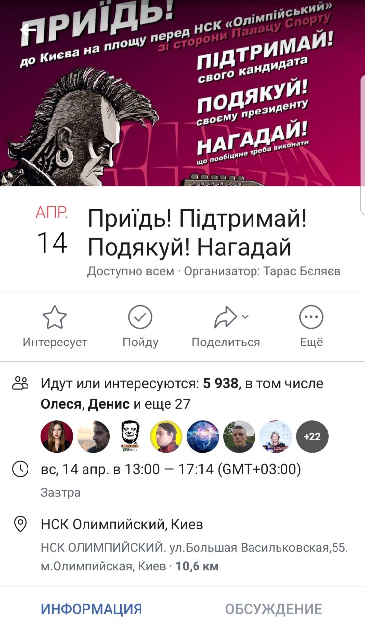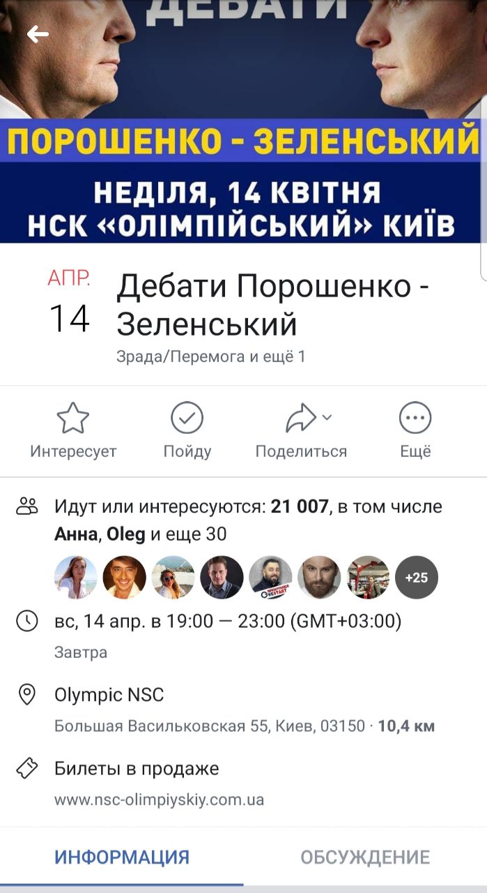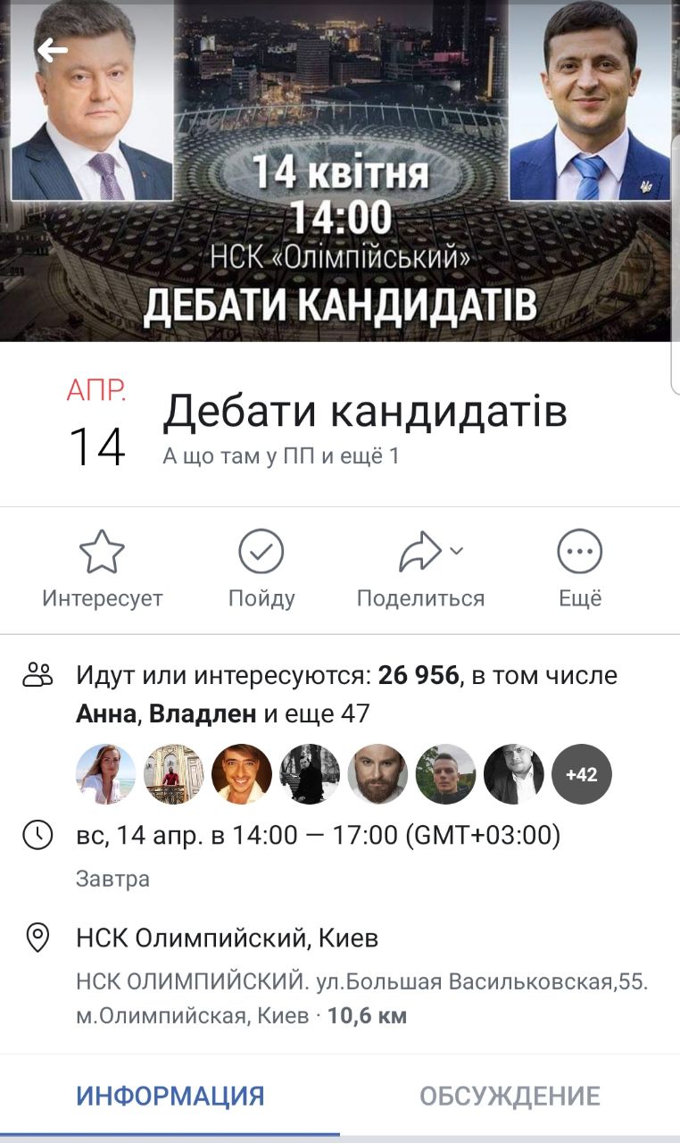 "Уважаемые кандидаты в президенты и их команды! 14 апреля 2019 года в 14:00 на НСК Олимпийском действительно состоятся дебаты, а именно панельная дискуссия представителей билетных операторов в рамках форума Kyiv Music Days 2019. Прошу прекратить запутывать граждан и срывать наше замечательное мероприятие. Ведь люди идут послушать нас, а не вас! С уважением, ваш избиратель", - указано в опубликованном сообщении.