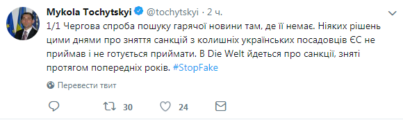 "Очередная попытка поиска горячей новости там, где ее нет. Никаких решений на днях о снятии санкций с бывших украинских чиновников ЕС не принимал и не готовится принимать. В Die Welt говорится о санкциях, которые были снятые в предыдущие годы", - написал Николай Точицкий.