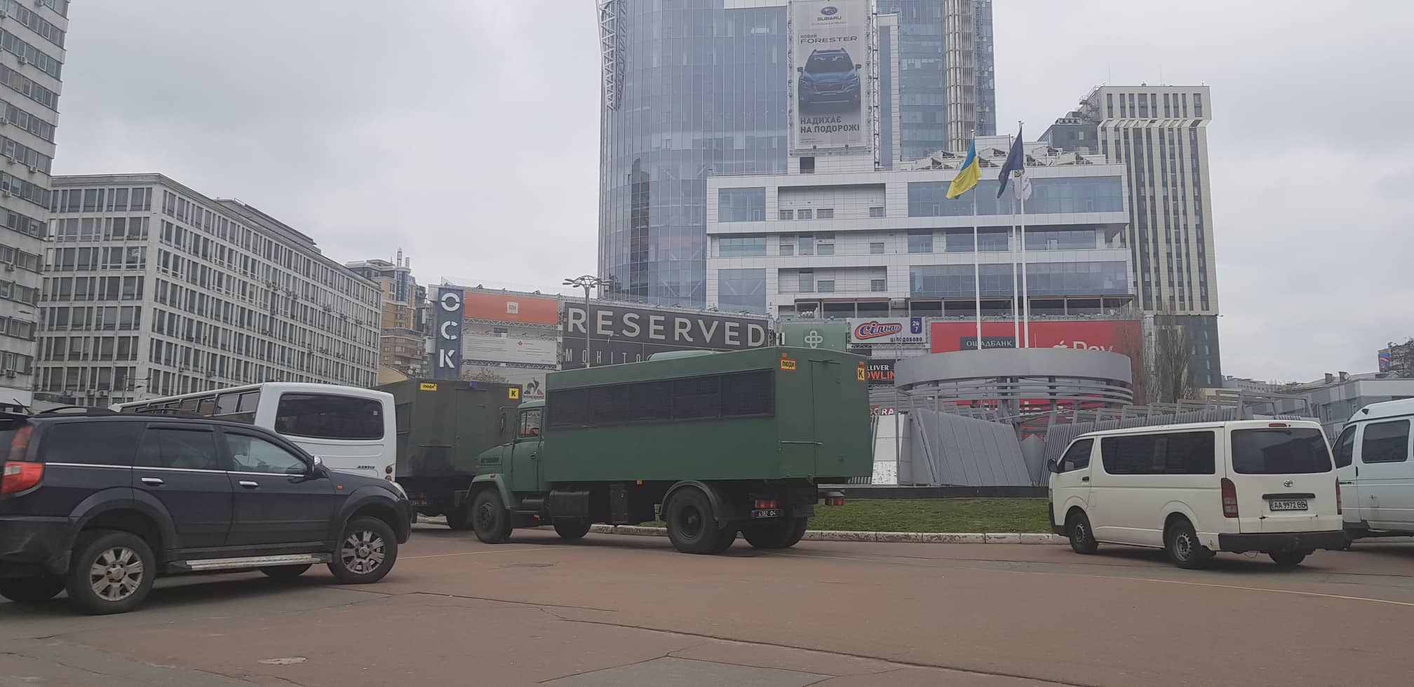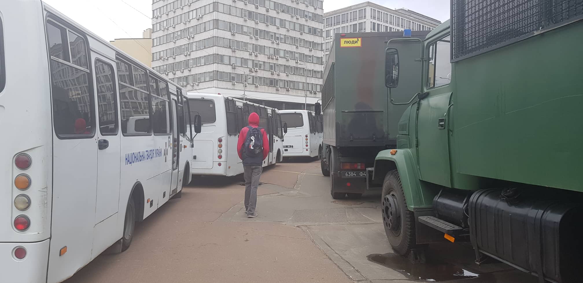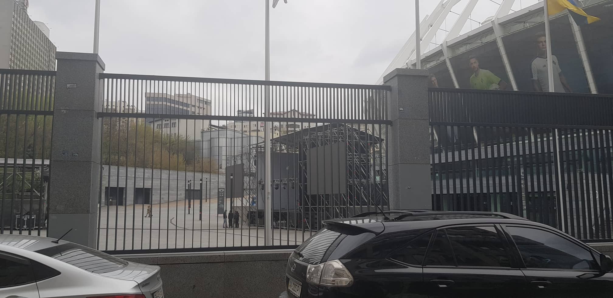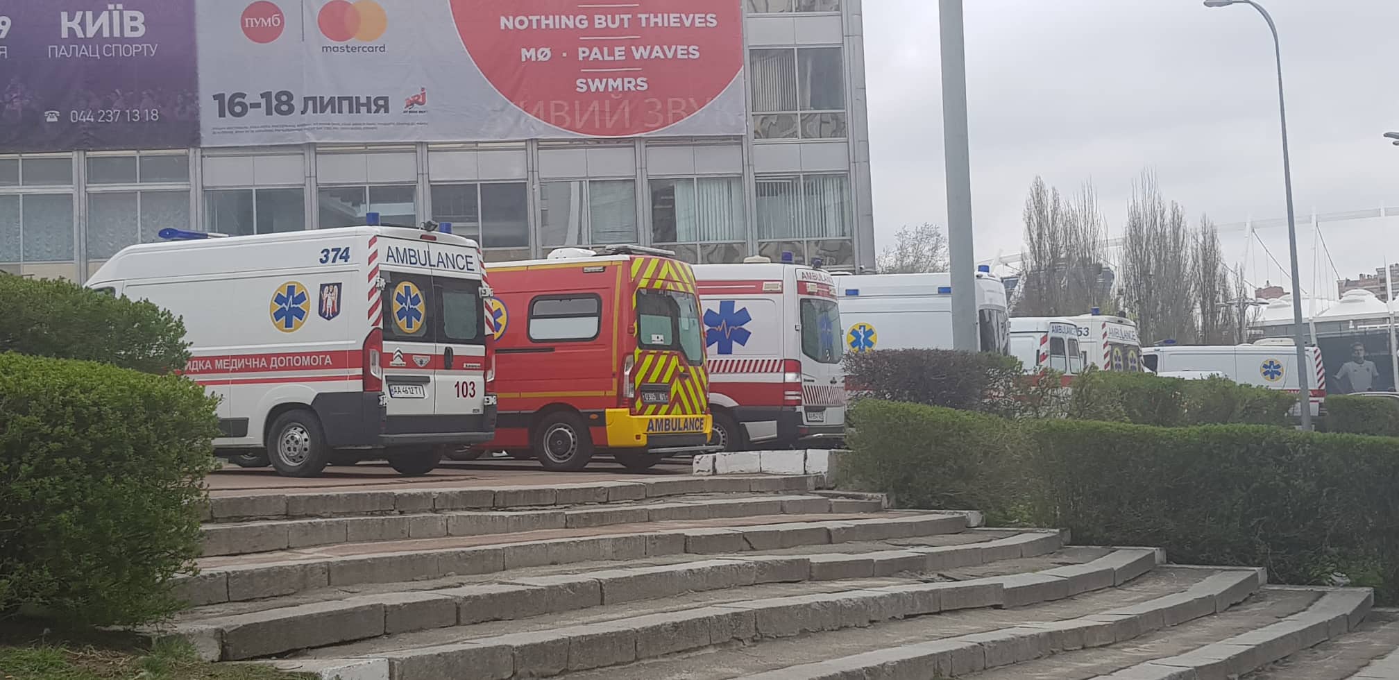 Как сообщает корреспондент "Страны", территорию уже оградили металлическим заборов. Также на площадке перед дворцом спорта уже стянули чуть больше десяти авто "скорой помощи" и автобусов Национальной гвардии. Они все пустые, внутри никого нет.