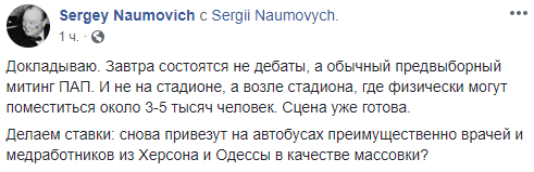 "Делаем ставки: снова привезут на автобусах преимущественно врачей и медработников из Херсона и Одессы в качестве массовки?" - написал в Facebook Сергей Наумович.