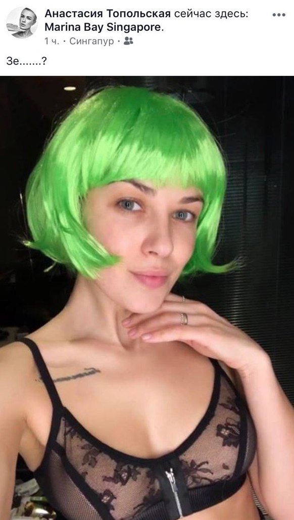 Топольская выложила в сеть снимок, где на ней из одежды только черный бюстгальтер и зеленый парик, подписав фото "Зе...?".
