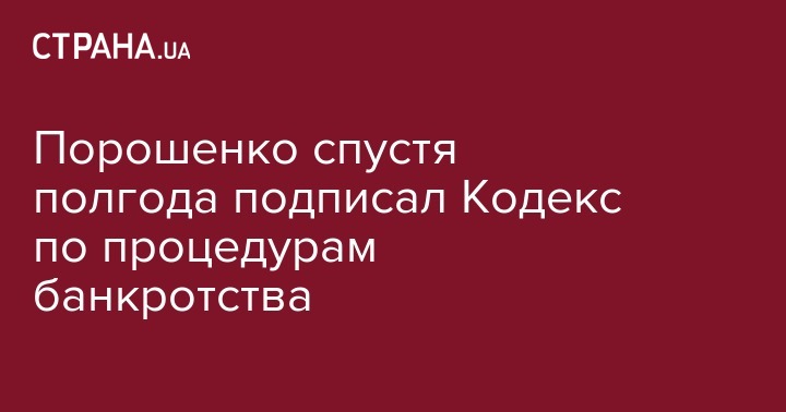 Как сообщала "Страна", 17 октября прошлого года Верховная Рада рассматривала Кодекс по процедурам банкротства и изменения в УК Украины. Президент Петр Порошенко заявлял, что готов в течение двух недель подписать Кодекс о процедурах банкротства после его изучения. Однако до настоящего времени Кодекс оставался не подписанным.