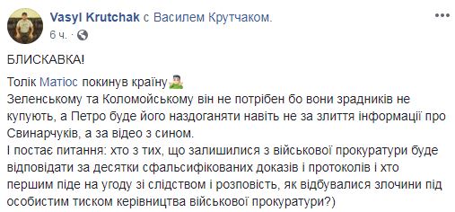 "Толик Матиос покинул страну. Зеленскому и Коломойскому он не нужен, потому что предателей не покупают, а Петр (Порошенко - прим. ред.) будет его догонять даже не из-за слива информации про Свинарчуков, а из-за видео с сыном", - написал Крутчак на своей странице в Facebook.