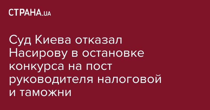 Окружной админсуд Киева 12 апреля 2019 года отказал экс-главе Государственной фискальной службы (ГФС) Роману Насирову в ходатайстве о приостановке конкурсов на должности глав Государственной налоговой службы (ГНС) и Государственной таможенной службы (ГТС) для обеспечения его иска к Кабинету министров. Об этом министр финансов Оксана Маркарова написала на своей странице в Facebook в понедельник.