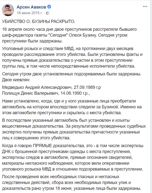 В итоге только в 2018 году суд начал рассматривать убийство Бузины по сути. Через три года после самого преступления.
