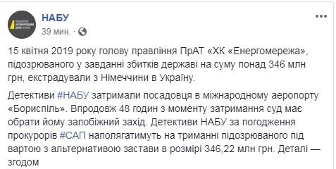 Отмечается, что Крючкова, экстрадированного в Украину из Германии, задержали в международном аэропорту "Борисполь". Он подозревается в нанесении ущерба государству на сумму свыше 346 млн грн, экстрадировали из Германии в Украину. "Детективы НАБУ задержали чиновника в международном аэропорту "Борисполь". В течение 48 часов с момента задержания суд должен избрать ему меру пресечения", - сказано в сообщении Нацбюро.