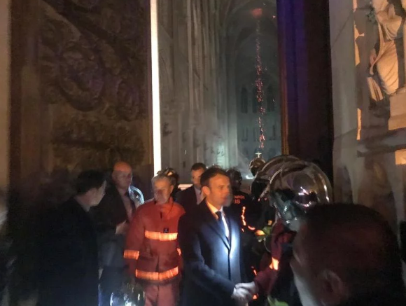 Президент в сопровождении своей жены и в окружении сотрудников экстренных служб вошел в Собор и прошел от входа с десяток метров. Президент Франции осмотрел внутреннюю часть помещения. В это время с потолка на пол сыпались искры, а под крышей догорало пламя.