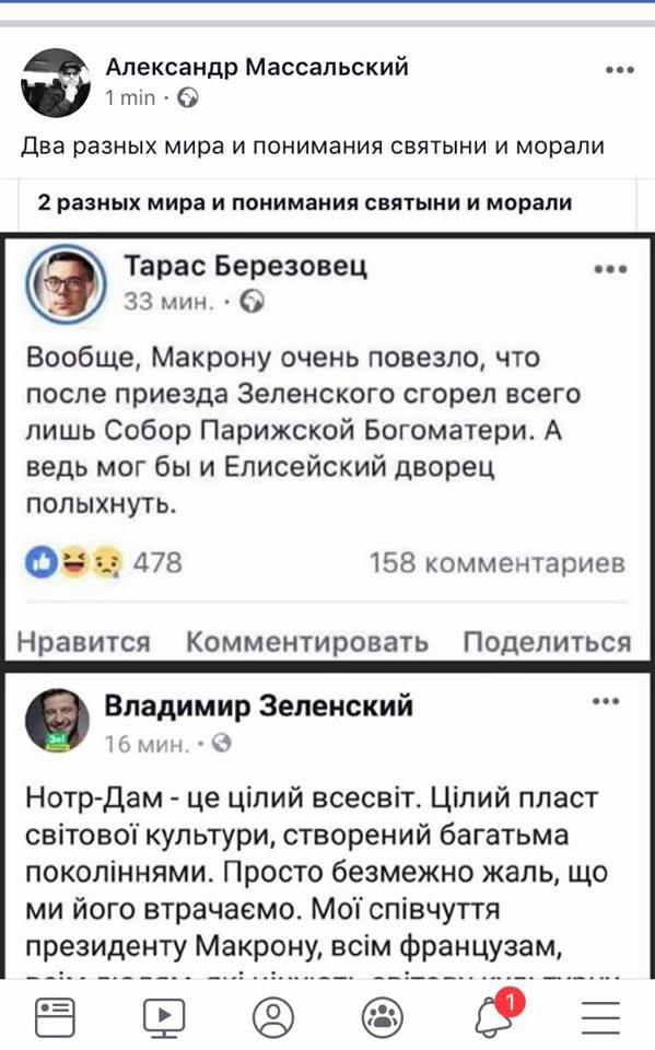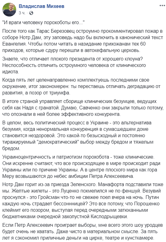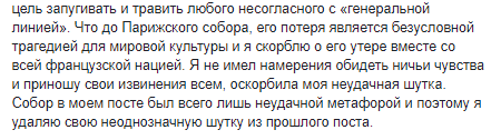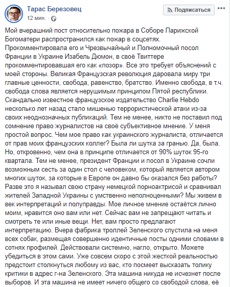 "Действовали системно, нагло, открыто. Можете убедиться в этом сами. Уже совсем скоро с этой жесткой реальностью предстоит столкнуться любому из вас, кто посмеет высказать толику критики в адрес г-на Зеленского... Что до Парижского собора, его потеря является безусловной трагедией для мировой культуры, и я скорблю о его утере вместе со всей французской нацией. Я не имел намерения обидеть ничьи чувства и приношу свои извинения всем, кого оскорбила моя неудачная шутка. Собор в моем посте был всего лишь неудачной метафорой, и поэтому я удаляю свою неоднозначную шутку из прошлого поста", – заявил Березовец.