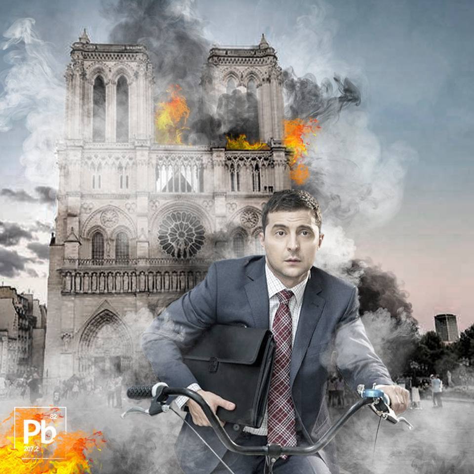 Параллельно в Facebook запустили коллаж. На нем Василий Голобородько, которого играет Зеленский в сериале "Слуга народа", едет на велосипеде, а за его спиной пылает Нотр-Дам.