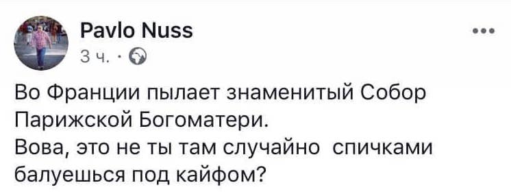 "Во Франции пылает знаменитый Собор Парижской Богоматери. Вова, это не ты случайно спичками балуешься под кайфом?"