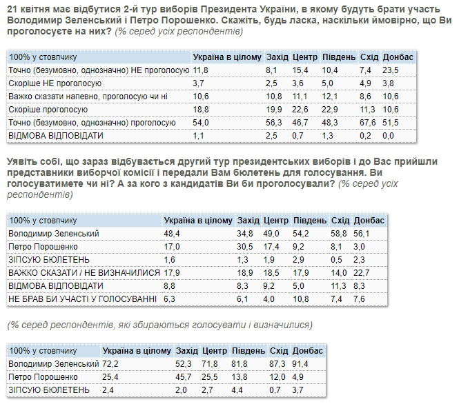 Таковы результаты опроса, проведенного Киевским международным институтом социологии. Опрос опубликован сегодня, 16 апреля. 54% респондентов на прямой вопрос о голосовании 21 апреля ответили, что они "точно будут голосовать", еще 18,8% "скорее будут голосовать". Скорее или точно не собираются голосовать - 15,5%. Затруднились или отказались отвечать - 11,7%.