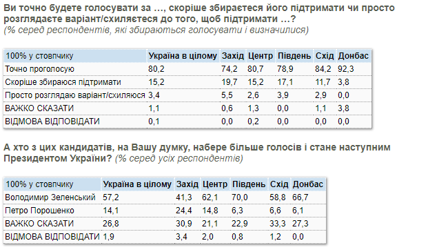 • На вопрос о предполагаемом победителя выборов 57,2% отвечают, что победит Владимир Зеленский, 14,1% - Петр Порошенко. Еще 28,7% респондентов не определились или отказались отвечать на вопросы.