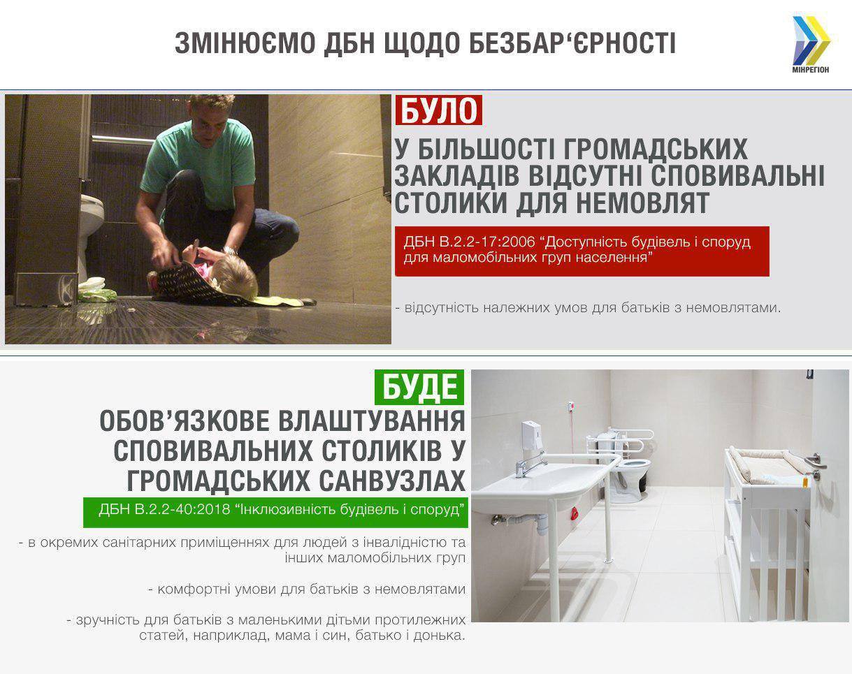 По его словам, Минрегион получил большое количество предложений относительно создания удобств для родителей с младенцами в общественных заведениях. Норму планируется перенести также в ГСН, касающиеся проектирования общественных заведений культуры, досуга, питания и других.