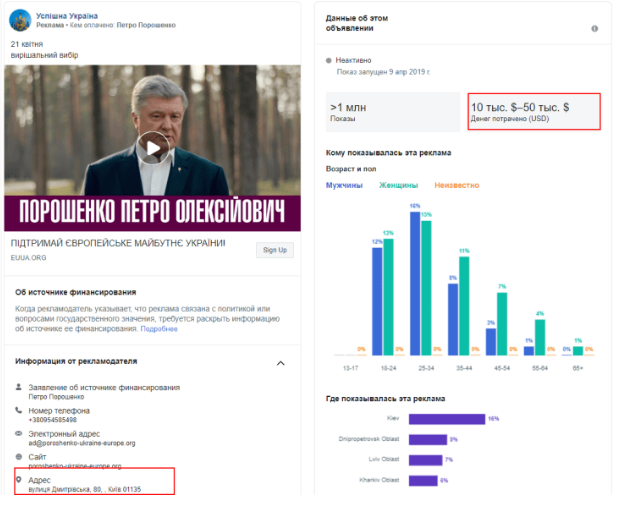 Благодаря тому, что Facebook раскрыл данные о заказчиках политической рекламы в соцсети, журналисту Евгению Спирину удалось узнать, что рекламные аккаунты, с которых запускалось продвижение на официальной странице Порошенко и в пабликах, публикующих антирекламу Владимира Зеленского и других соперников президента в первом туре, привязаны к одному и тому же номеру телефона. Он принадлежит сотруднице украинского цифрового агентства Postmen.