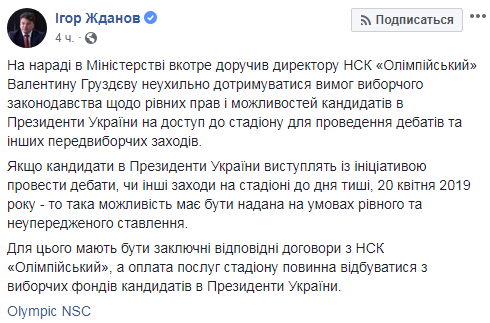 Министр молодежи и спорта Украины Игорь Жданов заявил, что руководство НСК "Олимпийский" должно обеспечить для кандидатов в президенты Петра Порошенко и Владимира Зеленского равные условия проведения дебатов. Об этом говорится на его Facebook-странице.
