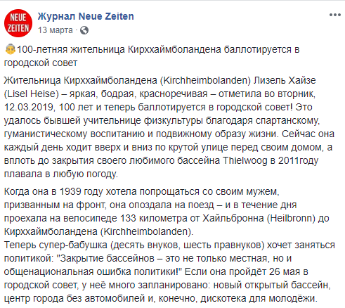 Бывшая школьная учительница физкультуры Лизель Хайзе после празднования своего 100-летнего юбилея решила баллотироваться на выборах в местный совет в Кирххаймболандене и открыть бассейн в своем родном городе. Об этом сообщает Deutsche Welle.