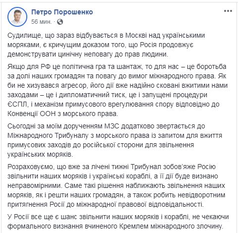 "Сегодня по моему поручению МИД дополнительно обращается в Международный трибунал по морскому праву с запросом для принятия принудительных мер к российской стороне для освобождения украинских моряков", - написал он.
