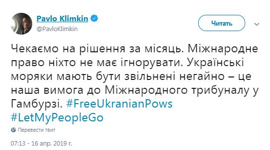В свою очередь министр иностранных дел Павел Климкин подчеркнул, что украинские моряки должны быть освобождены немедленно. "Ждем решения через месяц. Международное право никто не должен игнорировать. Украинские моряки должны быть освобождены немедленно - это наше требование к Международному трибуналу в Гамбурге", - написал глава МИД в Twitter.