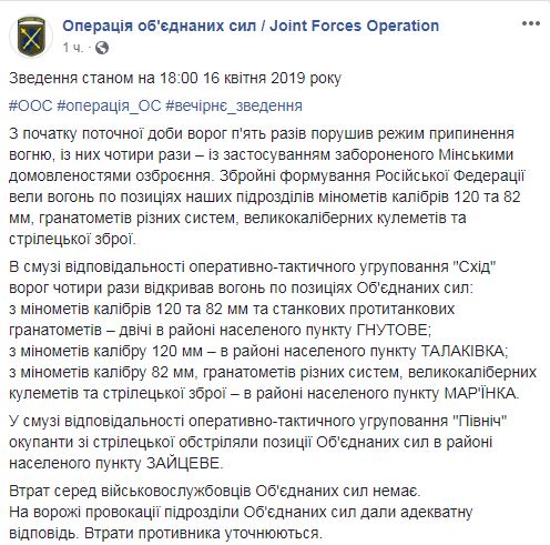 В штабе ООС отметили, что "сегодня вооруженные формирования РФ вели огонь по позициям украинских подразделений из минометов калибров 120 и 82 мм, гранатометов различных систем, крупнокалиберных пулеметов и стрелкового оружия".