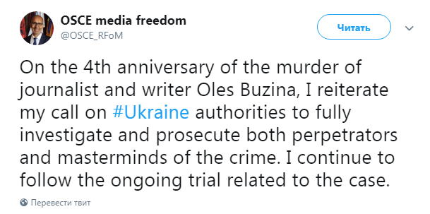 "В 4-ю годовщину убийства журналиста и писателя Олеся Бузины я вновь призываю украинские власти полностью расследовать и привлечь к ответственности как виновных, так и организаторов преступления. Я продолжаю следить за продолжающимся судебным разбирательством, связанным с делом", - сказано в сообщении.