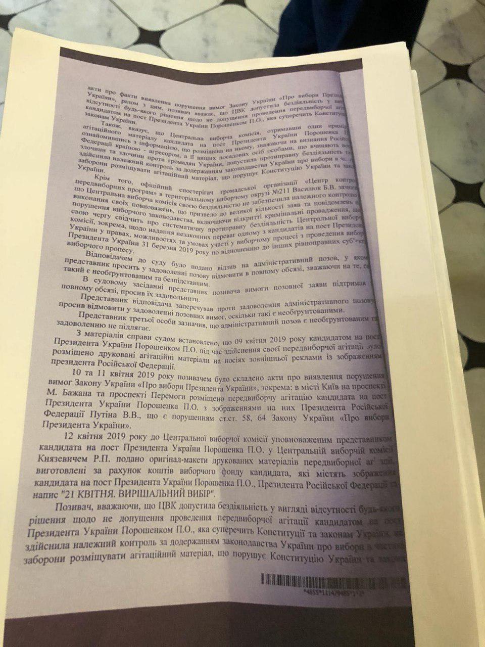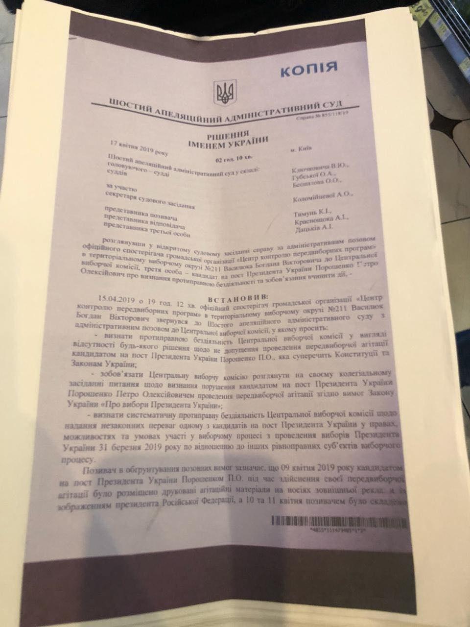 По словам ее представителя Богдана Василюка, организация подавала иск, в котором содержалось девять эпизодов, когда ЦИК бездействовала или отдавала предпочтение стороне Порошенко в каких-то вопросах: и борды с Путиным, и агитационные материалы, и скупка голосов, и присутствие СБУ на избирательных участках. Однако суд постановил, что по восьми из них уже есть другие решения суда, поэтому они пересматриваться не будут.
