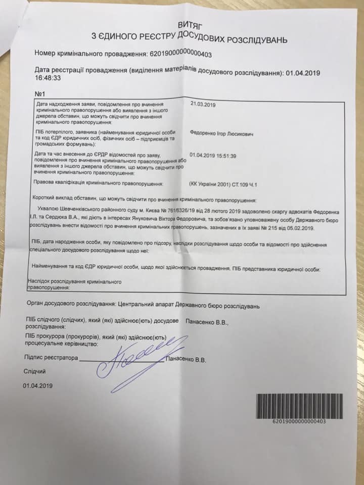 Государственное бюро расследований 1 апреля начало расследование уголовного производства по фактам возможной умышленной сдачи нынешними высшими должностными лицами Украины Крыма. Кроме того, их подозреват в насильственном захвате власти, государственной измене, а также организации массовых убийств на Майдане в 2014 году. Об этом сообщил адвокат Виталий Сердюк на своей странице в Facebook.