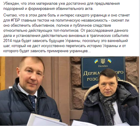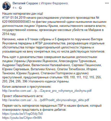 "Речь идет о доказательствах совершения высшими должностными лицами Украины (Арсением Яценюком, Александром Турчиновым, Андреем Парубием, Валентином Наливайченко, Сергеем Пашинским, Юрием Сергеевым, Виталием Кличко, Олегом Тягнибоком, Игорем Тенюхом, Юрием Луценко, Степаном Полтораком и другими) преступлений, предусмотренных статьями 109, 110, 111, 112, 115, 255, 293, 294, 295, 396 Уголовного кодекса Украины", - написал Виталий Сердюк.