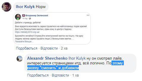 Программа увидела в главном оппоненте Порошенко - Владимире Зеленском, как это не удивительно, его сторонника. Проанализировав профиль Зеленского в Facebook, слева от ФИ пользователя появилась пресловутая буква "П" на фиолетовом фоне. В команде разработчиков пояснили выбор программы предпочтениями самого Владимира Зеленского, который как мы знаем, смотрел свои дебаты с Порошенко в прямом эфире на Facebook, не будучи присутствующим при этом на стадионе.