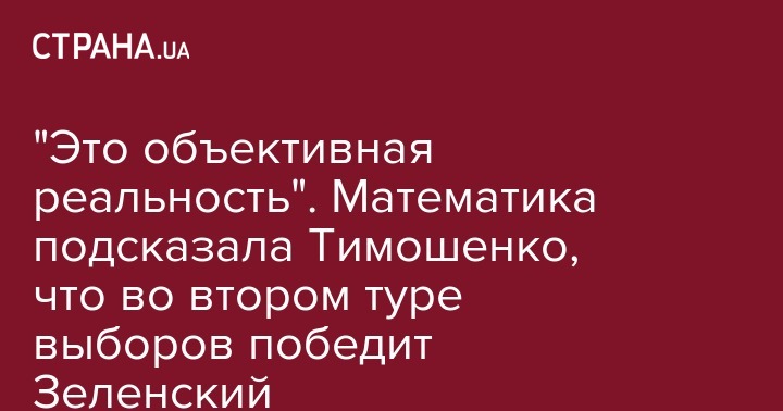 "Нам с вами нужно вернуться с политической войны, прекратить этот политический передоз в нашей ежедневной жизни и больше не задавать вопрос, за кого голосовать во втором туре. Потому что математика больших чисел уже говорит о том, что во втором туре победит Владимир Зеленский. Это объективная реальность. Нужно уже думать, как с этим жить дальше", - сказала Тимошенко в видеообращении, размещенном на ее странице в Фейсбуке в среду.
