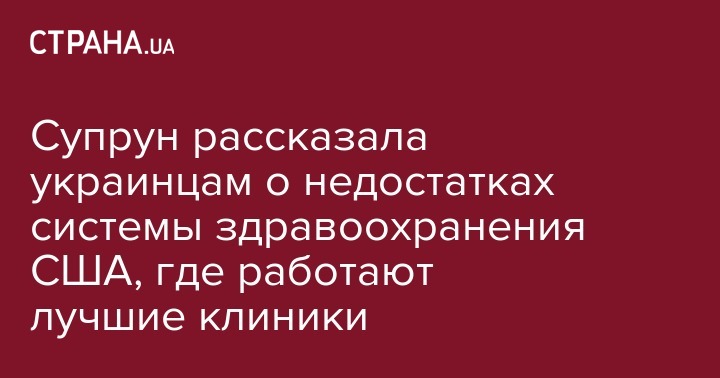 Американская система здравоохранения имеет ряд недостатков, в том числе, неэффективное распределение расходов, однако опыт работы некоторых клиник может с пользой применяться для украинских медицинских учреждений. Об этом сообщила и.о. министра здравоохранения Ульяна Супрун на своей странице в Facebook.