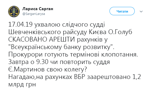 "Постановлением судьи Шевченковского райсуда Киева Оксаны Голуб отменены аресты счетов во "Всеукраинском банке развития". Прокуроры готовят срочные ходатайства", - написала Лариса Сарган.