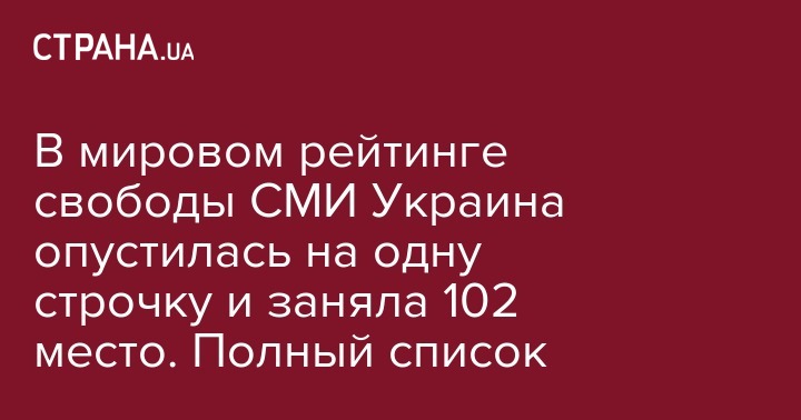 В новом рейтинге свободы слова от "Репортеров без границ" Украина заняла 102 место из 180 стран и опустилась на одну строчку по сравнению с прошлым годом. Об этом говорится в ежегодном индексе свободы СМИ в мире по состоянию на 2019 год, обнародованном 18 апреля, передает DW.
