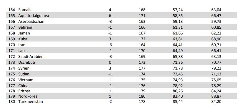 В индексе свободы СМИ соседняя РФ заняла 149-е место - на одну строчку ниже по сравнению с прошлогодними показателями. "Значительное улучшение ситуации со свободой слова наблюдалось в 2018 году в Армении, которая поднялась сразу на 19 ступенек, заняв 61-е место в рейтинге. Существенное облегчение для работы журналистов было зафиксировано и в Кыргызстане, который за год поднялся сразу на 15 ступенек, заняв 83-е место", - говорится в отчете.
