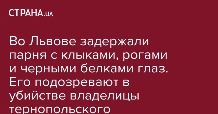 Правоохранители задержали 25-летнего парня с клыками, рогами и черными белками глаз. Его подозревают в убийстве владелицы тернопольского тату-салона, которое произошло в ночь с 15 на 16 апреля. Об этом сообщает Отдел коммуникаций ГУ НП в Тернопольской области.