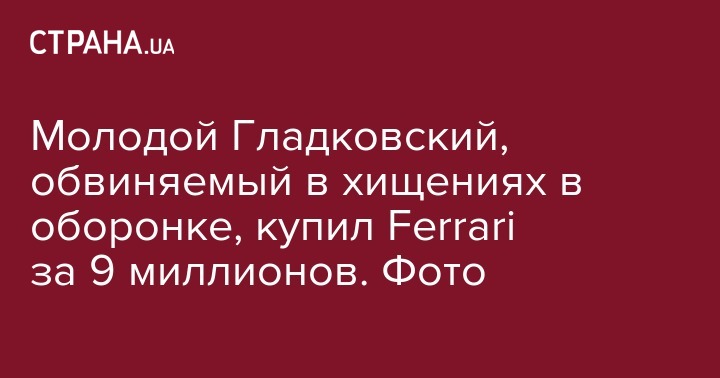 Сын бизнес-партнера Петра Порошенко Олега Гладковского Игорь Гладковский (Свинарчук), замешанный в скандале с хищениями в украинской оборонке, купил элитный спорткар Ferrari, цена которого на первичном рынке составляет около 300 тысяч евро (около 9 миллионов гривен).