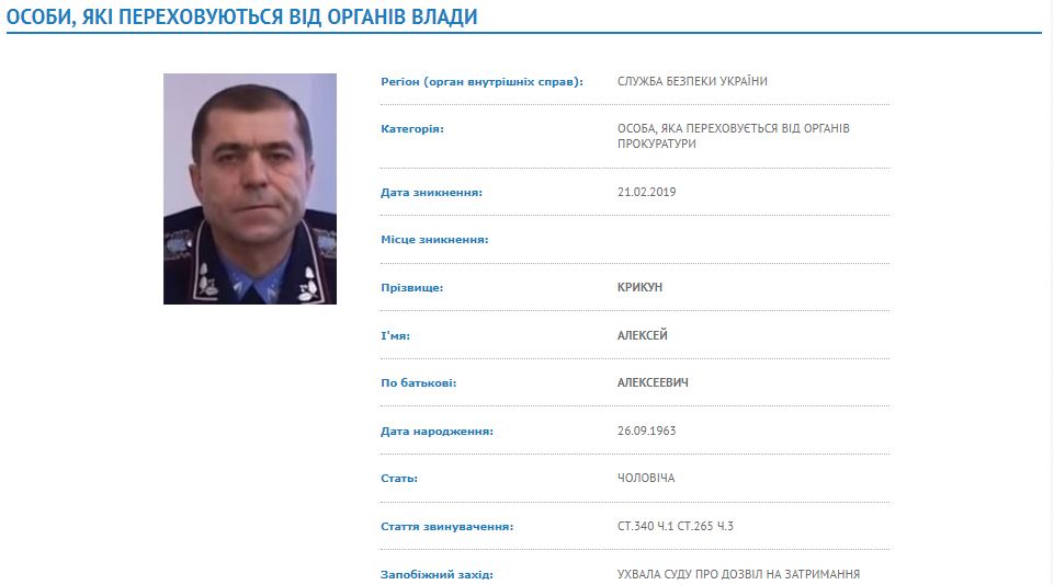 Указано, что Крикун скрывается от прокуратуры и разыскивается СБУ. Он исчез из поля зрения украинских правоохранителей 21 февраля текущего года. Ему предъявлено подозрение по статье "незаконное воспрепятствование организации или проведению собраний, митингов, шествий и демонстраций" и "приобретение, ношение, хранение, использование, передача, видоизменение, уничтожение, распыление или разрушение радиоактивных материалов (источников ионизирующего излучения, радиоактивных веществ или ядерных материалов) без предусмотренного законом разрешения) Уголовного кодекса. Получено разрешение суда на задержание генерала. Правоохранители считают Крикуна причастным к разгону Майдана.