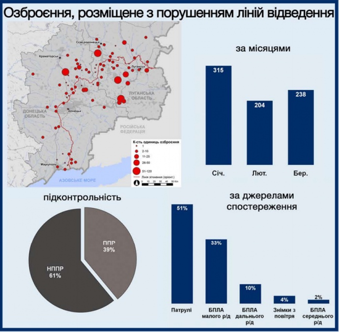 Также отмечается, что в первом квартале 2019 года СММ зафиксировала 757 единиц вооружения, размещенных с нарушением согласованных линий отвода, что на 19% меньше, чем в последнем квартале 2018 года."Более 60% таких единиц вооружения были размещены в неподконтрольных правительству районах, около 40% – в подконтрольных", - говорится в отчете.