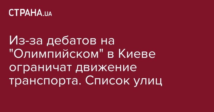 В пятницу, 19 апреля, из-за проведения дебатов на НСК "Олимпийский" в Киеве будут действовать ограничения движения транспорта на некоторых улицах. Об этом сообщает Telegram-канал Kyiv LIVE.