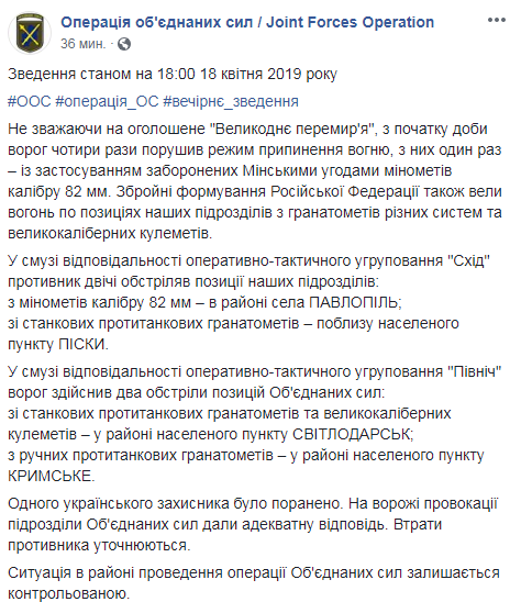 С начала суток четверга, 18 апреля, незаконные вооруженные формирования четыре раза нарушили режим прекращения огня в зоне ООС. Один украинский военный получил ранения. Об этом сообщает пресс-центр штаба ООС.