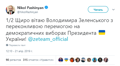10.51 А вот премьер-министр Армении Никол Пашинян, не в пример Жириновскому, поздравил Владимира Зеленского с победой на выборах. Любопытно, что свое поздравление в Twitter армянский премьер написал на украинском языке.
