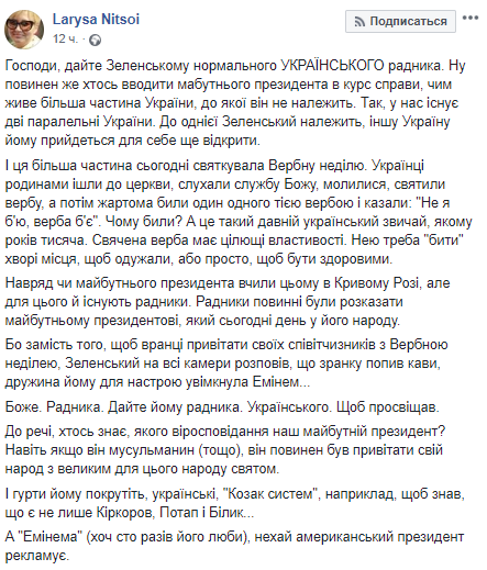 10.14 Скандально известная украинская писательница Лариса Ницой высказала негодование, что Владимир Зеленский в день второго тура президентских выборов, совпавшим с Вербным воскресеньем, не поздравил украинцев с этим днем, знаменующим начало Страстной недели.