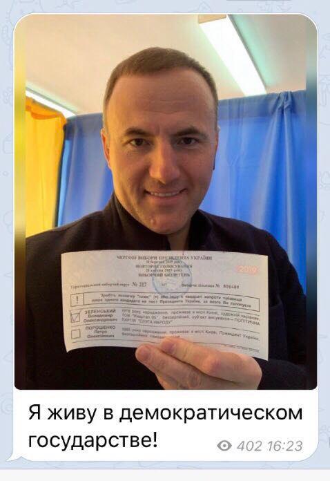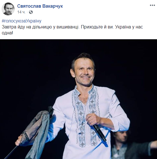 Вчера вечером он опубликовал пост, где, как и президент, призвал приходить на участок в вышиванке. И добавил тот же хештег, что использовал Порошенко - #голосуюзаУкраїну.