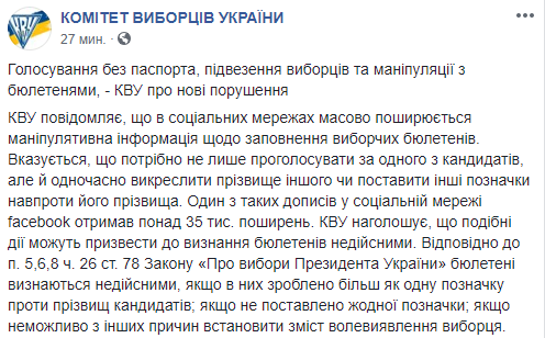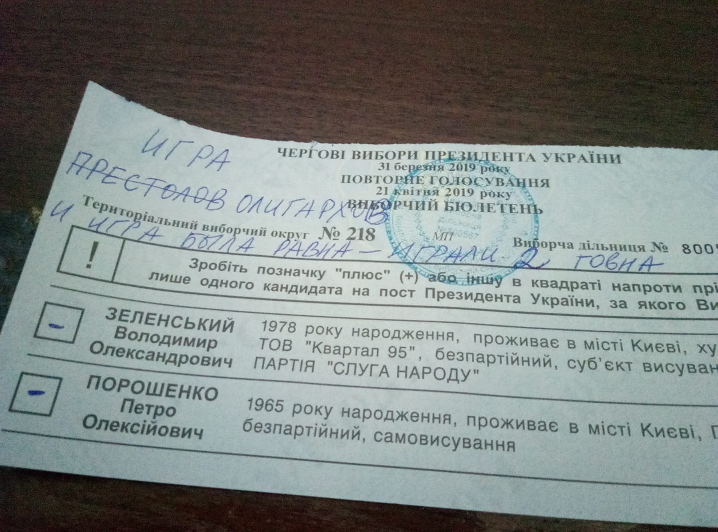 Люди закрашивали бюллетени или же писали свои мысли. Кое-кто дорисовывал графу "против всех" и ставил там галочку, а на других размашисто писали "Идите к черту". А на избирательном участке № 800635 в Подольском районе Киева один из бюллетеней был испачкан коричневым веществом.